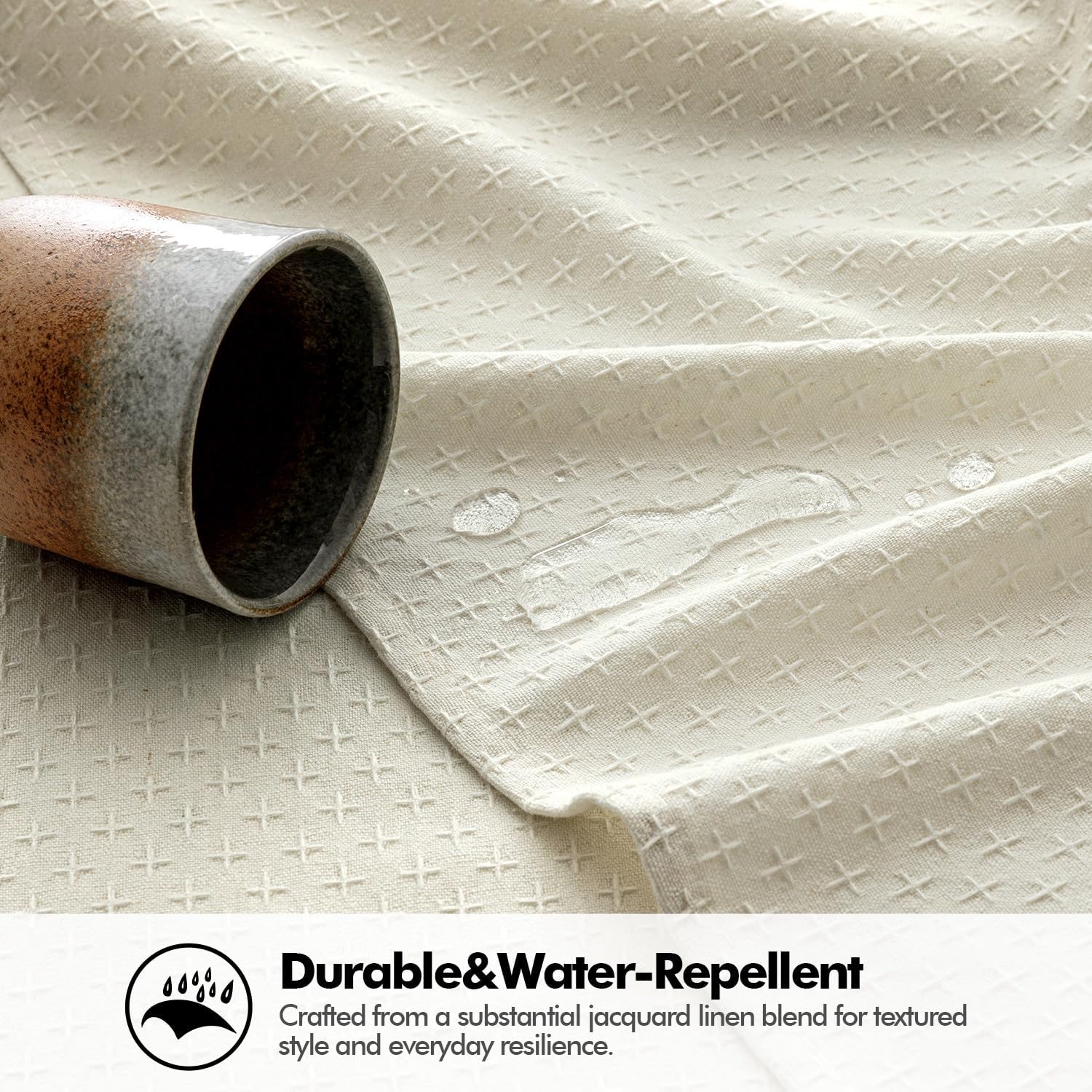 Premium Fabric: This durable tablecloth is made of high grammage (30% higher than others) polyester linen textured fabric to ensure the protection of your table and furniture. The polyester linen looks very sturdy and has a cross star shaped jacquard texture. Made of well treated fabric, this table cloth is thick, durable, soft, spill resistant, scratch resistant, and wrinkle resistant