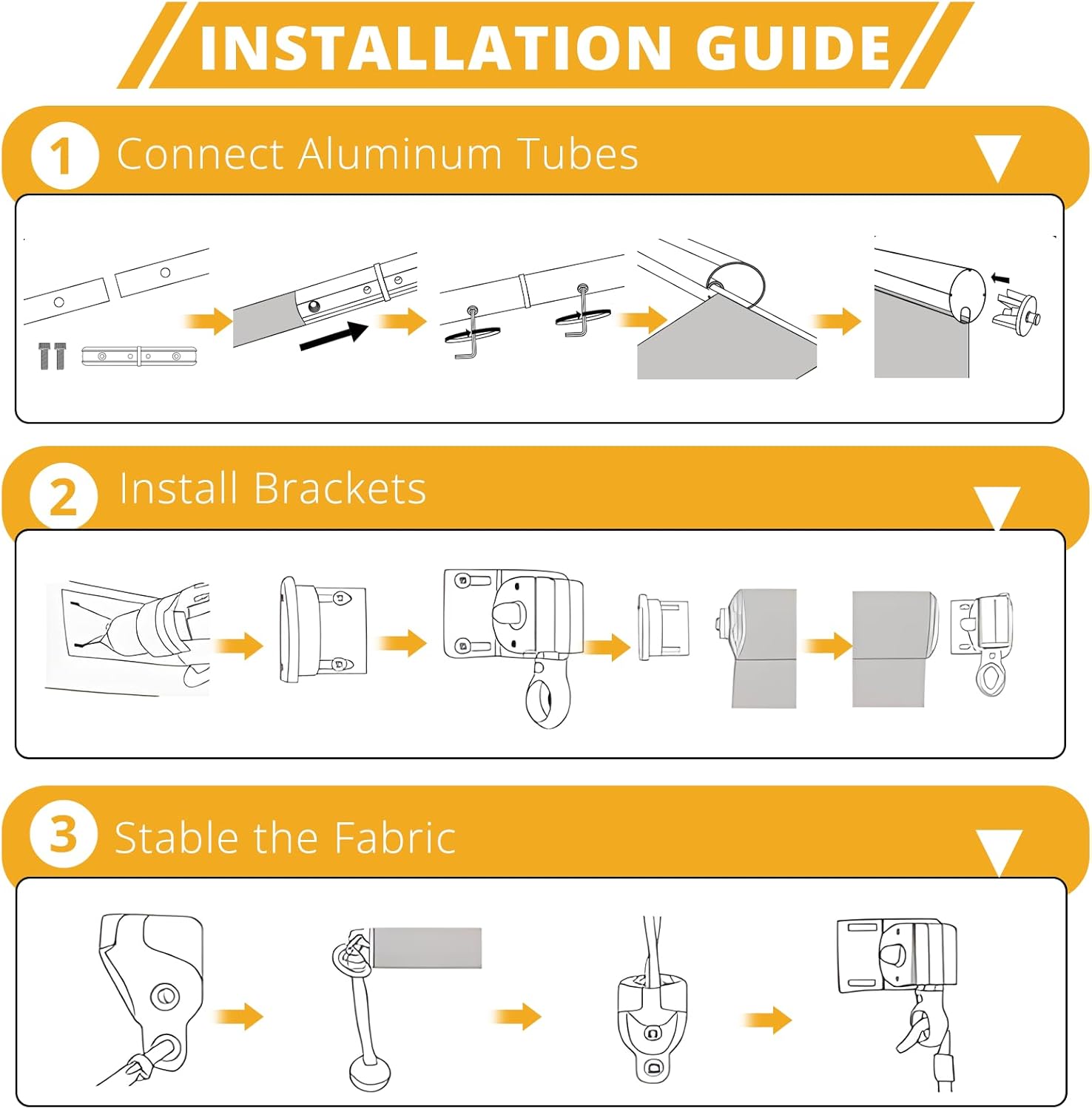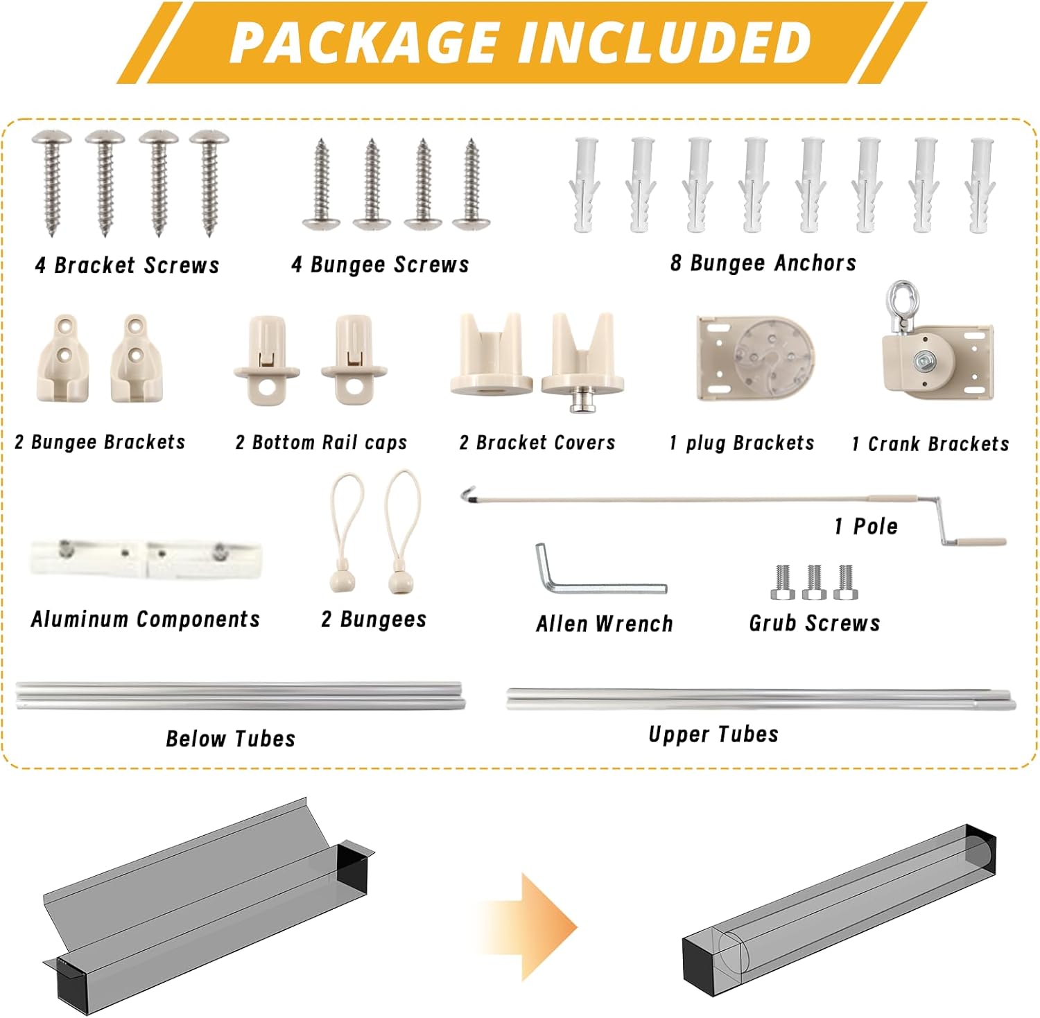 We have also meticulously selected the accessories, including 4 bracket screws, 4 bungee anchors, 4 bungee screws, 2 bottom rail caps, 2 bungee brackets, 2 bracket covers, 1 pole, 1 plug bracket, 1 crank bracket, 2 bungees, 1 below tube, 1 upper tube, 1 aluminum component, 3 crub screws, and 1 allen wrench.